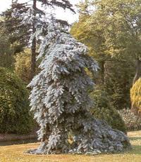 PICEA PUNGENS GLAUCA PENDULA– Weeping Blue Spruce- Requires staking for height, resonablly fast growth (12” per year) is not uncommon, great blue color, mounding habit with a skirt as tree ages, deer resistant, very adaptable to many climates and soils, very hardy zone 3.